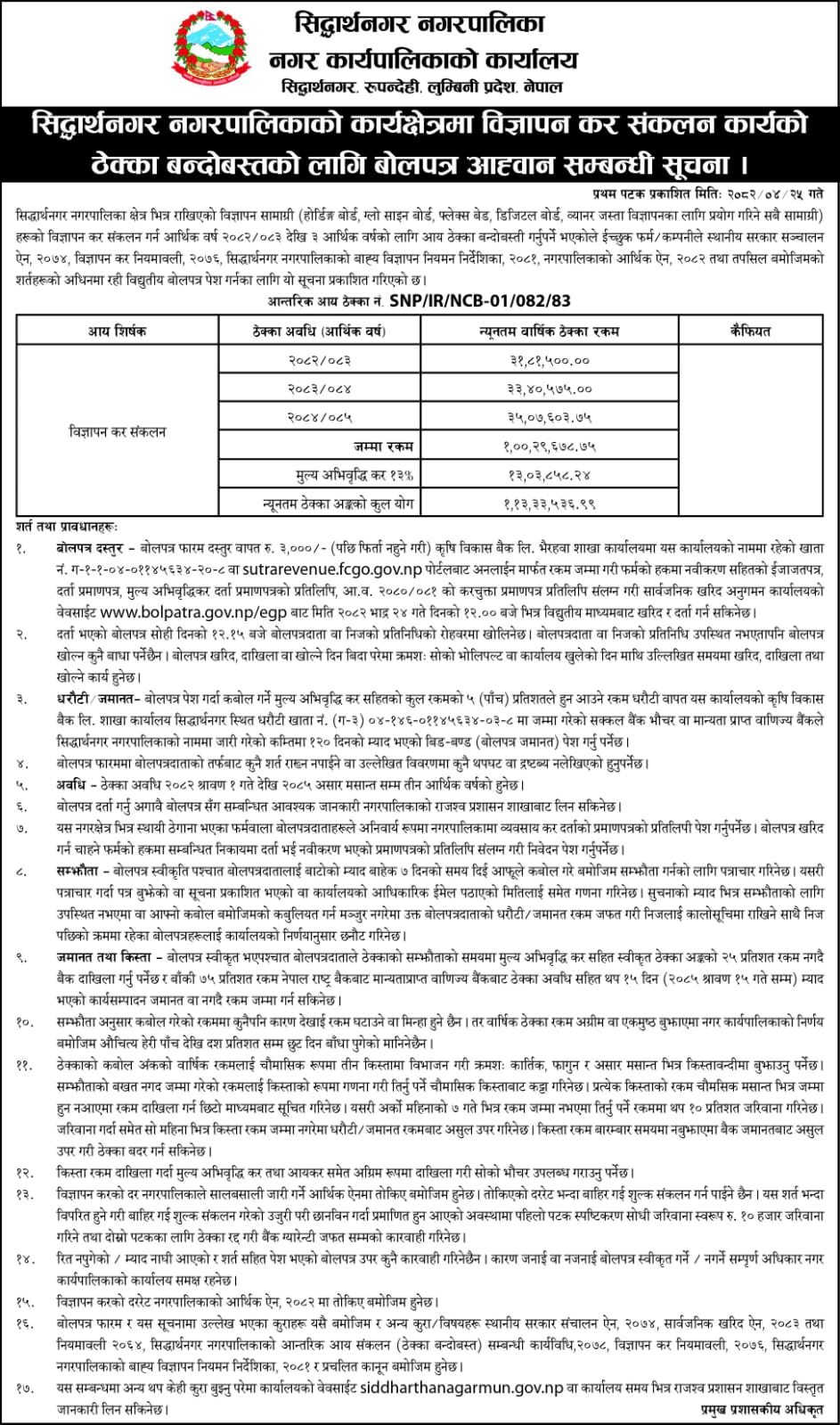 सिद्धार्थनगर नगरपालिकाको कार्यक्षेत्रमा विज्ञापन कर संकलन कार्यको ठेक्का बन्दोबस्तको लागि बोलपत्र आहवान सम्बन्धी सूचना l