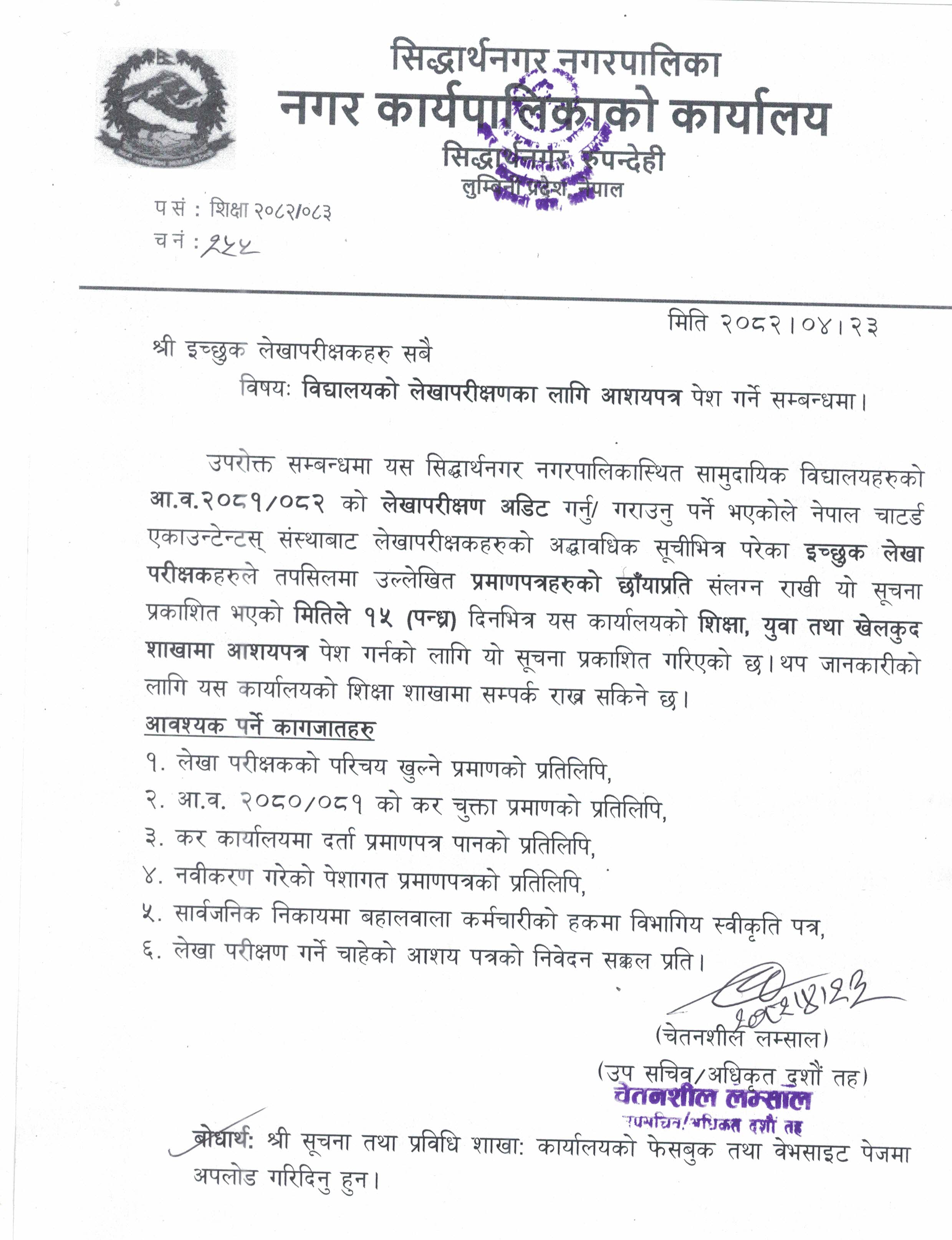 विद्यालयको लेखापरीक्षणका लागि आशयपत्र पेश गर्ने सम्बन्धमा ll