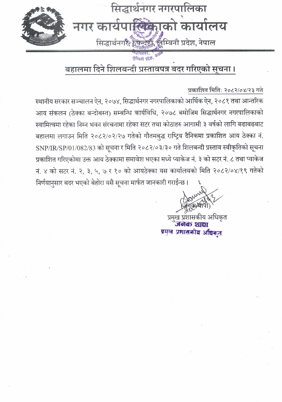 * सिद्धार्थनगर नगरपालिकाको स्वामित्वमा रहेका भवनका सटरहरु बहालमा दिने शिलबन्दी प्रस्ताव स्थगित गरिएको सूचना l