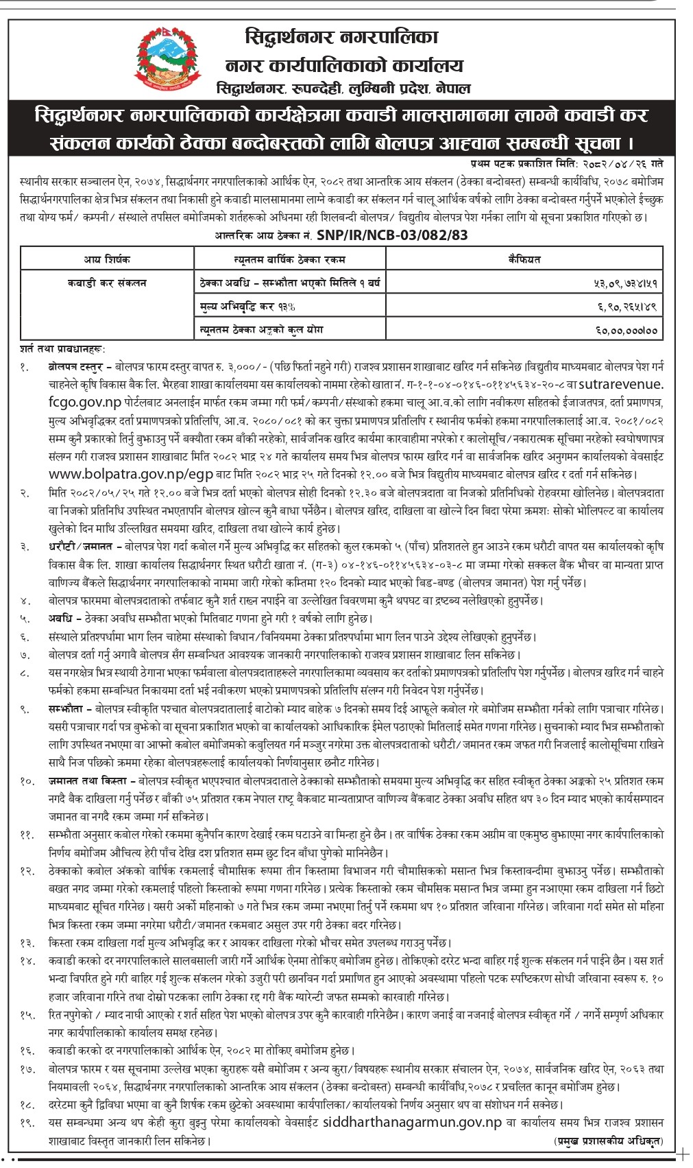 * सिद्धार्थनगर नगरपालिकाको कार्यक्षेत्रमा कवाडी मालसामानमा लाग्ने कवाडी कर संकलन कार्यको ठेक्का बन्दोबस्तको लागि बोलपत्र आहवान सम्बन्धी सूचना lll